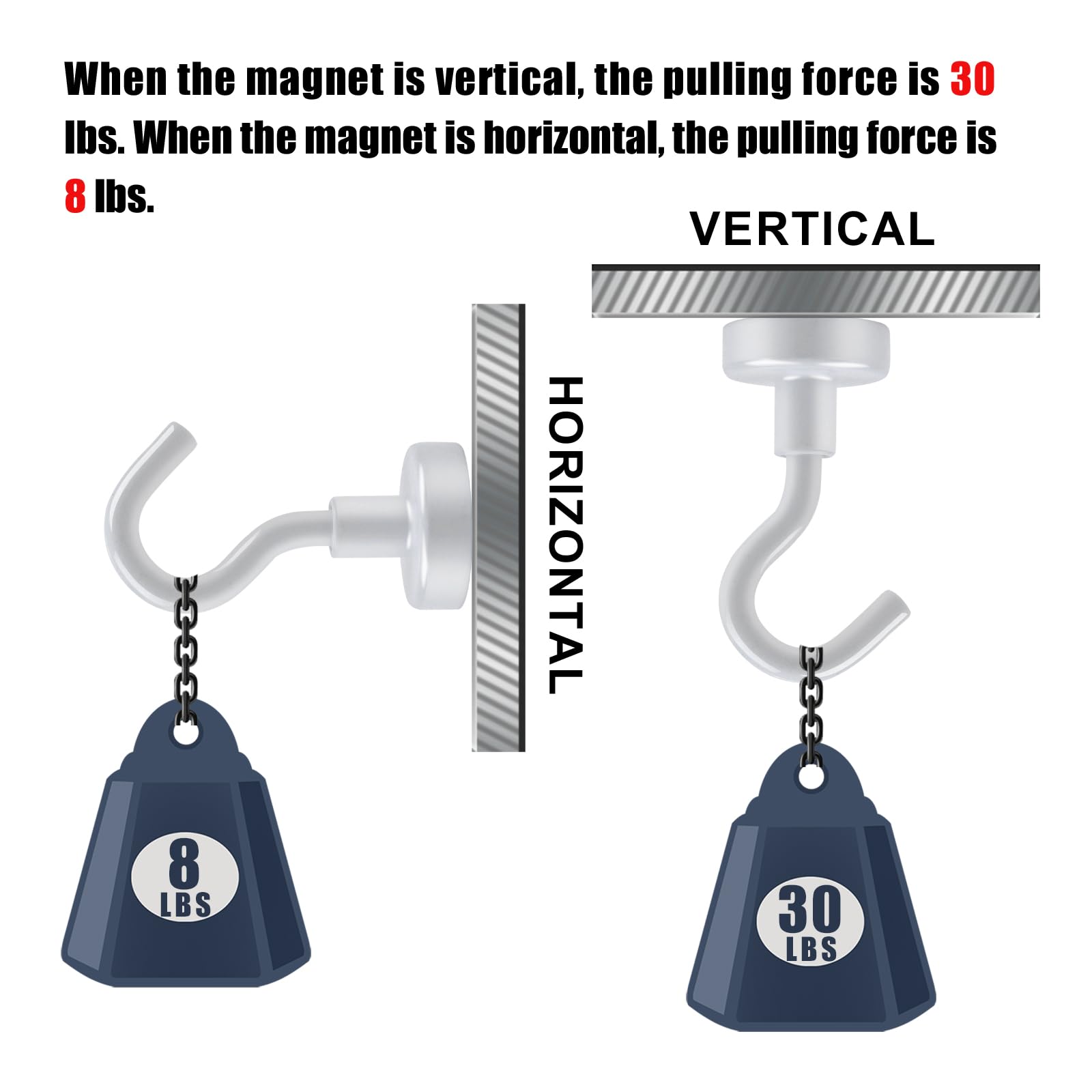 POWERFUL & DURABLE:We provide 3 layers of coating on the metal base, metal hook and magnet: Ni-Cu-Ni, so our magnet hooks have excellent anti-corrosion and scratch resistance. The magnetic hooks use high-quality neodymium magnets, which provide a strong magnetic force and can hang items weighing up to 30 pounds